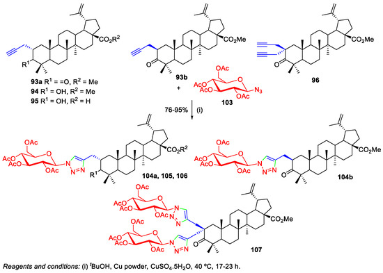 The use of sugars as substrates to perform click chemistry bioconjugation with BA can also be found in the literature [55,60]. Spivak et al. reported the Cu(I)-catalyzed 1,3-dipolar cycloaddition reaction of C(2)-propargyl-substituted BA derivatives (93a,b and 94–96) and the azide-β-D-glucopyranoside 103 to prepare 1,2,3-triazole-containing BA–glucopyranosides conjugates 104a,b and 105–107 (Scheme 22) [55]. The synthesis of the required alkynyl BA derivatives 93a,b and 94–96 was performed via α-alkylation of methyl betulonate with propargyl bromide and was discussed in Section 2.4 of this work.