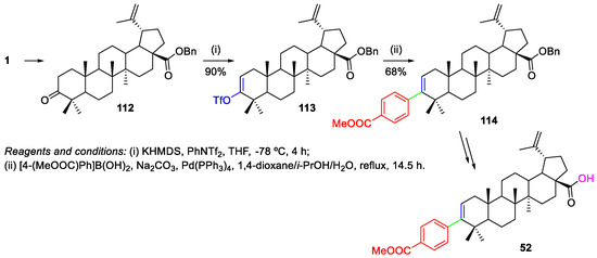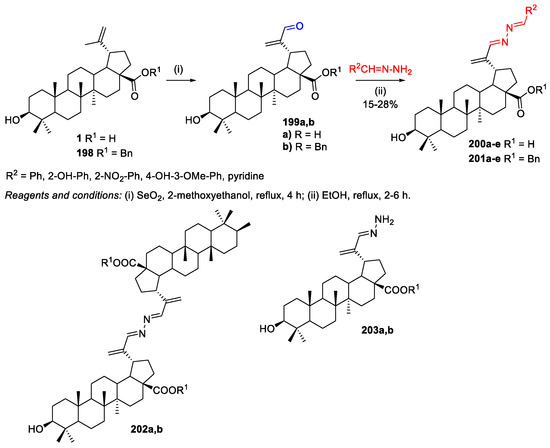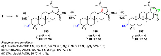 Due to the proven biological properties demonstrated by these natural and synthetic triterpenes, many studies involving them have been reported in the literature. In 2014, Shi et al. published a review covering the synthesis of novel triterpenoids derived from BN 2 and BA 1 calling upon different methodologies from 2006 to 2012, excluding the synthesis of triterpenoid glycosides [9]. Other reviews deal with transformations of triterpenes in general, but also included BA and its analogues, namely recent advances in the synthesis and biological activity of triterpenic acylated oximes [10] and pentacyclic triterpenoids with nitrogen- and sulfur-containing heterocycles [11]. In addition, in 2017, Zhou et al. summarized the advances in triterpenic-based prodrug strategies, including lupane-type triterpenes [12]. More recently, Borkova and co-workers reviewed the advances in the synthesis of A-ring modified BA derivatives and their application as potential therapeutic agents [13]. Furthermore, Pokorny et al. reviewed all reports on click reaction in the chemistry of triterpenes, including a number of derivatives of BA 1 and its analogues [14].