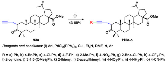 This bibliographic appraisal is organized as follows: in Section 2, the functionalization of the referred triterpenes through simple transformations such as amination, esterification, sulfonation, and alkylation reactions are addressed. Section 3 is devoted to the synthesis of 1,2,3-triazole-linked BA/BN/BoA/HBA-based hybrid compounds by click chemistry. In Section 4, the decoration of BA/BN/BoA/HBA carbon skeletons by palladium-catalyzed cross-coupling reactions is reported. In Section 5, C(2)-hydroxy-BA/BN/BoA/HBA are prepared through hydroxylation reactions. In Section 6, traditional aldol condensation reactions performed on 3-oxotriterpenes are shown. In Section 7 and Section 8, the synthesis of heterocycle-fused BA/HBA derivatives and polymer‒BA conjugates is discussed, respectively. In Section 9, BA/BN/BoA/HBA-based compounds prepared by different methodologies, which do not fit in the previous sections, are presented, while Section 10 presents the main conclusions. Some insights about the biological properties of some of the compounds prepared through the referred methodologies will also be given throughout this review.