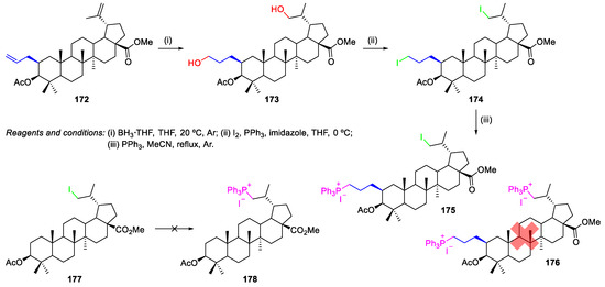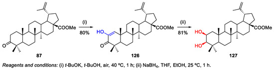 Another example of a simple transformation that has been very useful to functionalize BA 1 is alkylation reactions [54,55,56,57]. The obtained C(2)- or C(3)-alkylated compounds were used as important intermediates to prepare more complex ones as shown in the following sections.