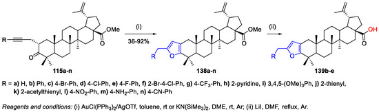 - Gubaidullin, R.R.; Khalitova, R.R.; Galimshina, Z.R.; Spivak, A.Y. Synthesis of novel [3,2-b]furan-fused pentacyclic triterpenoids via gold-catalyzed intramolecular heterocyclization of 2-alkynyl-3-oxotriterpene acids. Tetrahedron 2018, 74, 1888–1899. [Google Scholar] [CrossRef]