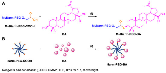 - Dai, L.; Li, D.; Cheng, J.; Liu, J.; Deng, L.-H.; Wang, L.-Y.; Lei, J.-D.; He, J. Water soluble multiarm-polyethylene glycol–betulinic acid prodrugs: Design, synthesis, and in vivo effectiveness. Polym. Chem. 2014, 5, 5775–5783. [Google Scholar] [CrossRef]
