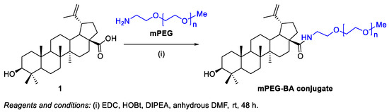 - Saneja, A.; Sharma, L.; Dubey, R.D.; Mintoo, M.J.; Singh, A.; Kumar, A.; Sangwan, P.L.; Tasaduq, S.A.; Singh, G.; Mondhe, D.M.; Gupta, P.N. Synthesis, characterization and augmented anticancer potential of PEG-betulinic acid conjugate. Mater. Sci. Eng. C 2017, 73, 616–626. [Google Scholar] [CrossRef] [PubMed]