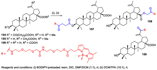 - Yao, H.; Wei, G.; Liu, Y.; Yao, H.; Zhu, Z.; Ye, W.; Wu, X.; Xu, J.; Xu, S. Synthesis, Biological Evaluation of Fluorescent 23-Hydroxybetulinic Acid Probes, and Their Cellular Localization Studies. ACS Med. Chem. Lett. 2018, 9, 1030–1034. [Google Scholar] [CrossRef] [PubMed]