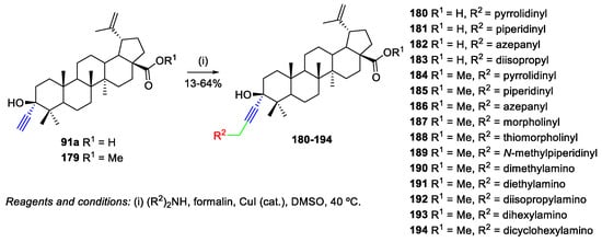 - Csuk, R.; Nitsche, C.; Sczepek, R.; Schwarz, S.; Siewert, B. Synthesis of Antitumor-Active Betulinic Acid-Derived Hydroxypropargylamines by Copper-Catalyzend Mannich Reactions. Arch. Pharm. 2013, 346, 232–246. [Google Scholar] [CrossRef] [PubMed]