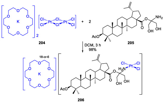 - Kaluđerović, G.; Bulatović, M.; Krajnović, T.; Paschke, R.; B. Zmejkovski, B.; Maksimović-Ivanić, D.; Mijatović, S. (18-Crown-6)potassium(I) Trichlorido[28-acetyl-3-(tris-(hydroxylmethyl)amino-ethane)betulinic ester-κN]platinum(II): Synthesis and In Vitro Antitumor Activity. Inorganics 2017, 5, 56. [Google Scholar] [CrossRef]