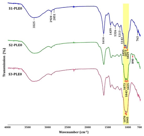 Fourier-transform infrared spectroscopy (FT-IR) analysis is a powerful tool for identifying characteristic functional groups and linkage bonds in polysaccharides, clearly revealing characteristic absorption peaks of polysaccharides [29]. The FT-IR spectra for S1-PLE0, S2-PLE0, and S3-PLE0 are shown in Figure 2.
