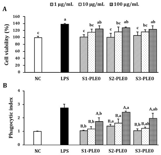 Compared to non-activated macrophages, several distinguishing features were observed in activated macrophages, such as phagocytosis and engulfment and destruction of foreign substances [33]. After phagocytosis, macrophages become antigen-presenting cells and interact with lymphocytes to regulate adaptive immune responses [4]. Therefore, the effects of three PLE0s on the phagocytic activity of RAW264.7 cells were evaluated using a neutral red phagocytosis assay. Neutral red internalization increased significantly after treatment with S1-PLE0, S2-PLE0, or S3-PLE0 (1–100 μg/mL) compared to the negative control (p < 0.05; Figure 3B). At 100 μg/mL, the phagocytic indices of S1-PLE0, S2-PLE0, and S3-PLE0 were 1.72, 2.41, and 1.95, respectively. S2-PLE0 exhibited much stronger phagocytic activity than S1-PLE0 and S3-PLE0. These results suggested that all three PLE0s could activate, trigger, and increase phagocytosis in macrophages. In particular, S2-PLE0 treatment was the most potent enhancer of macrophage activation.