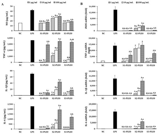 Macrophages are key cells in innate immune responses that can kill pathogens directly by phagocytosis or indirectly by secreting bioactive molecules such as nitric oxide (NO), interleukin (IL)-6, IL-12, and tumor necrosis factor (TNF)-α [32]. Modulating these systems can significantly impact both humoral and cellular immune responses [19]. Here, the cytotoxic effects of PLE0s on RAW264.7 cells were examined at concentrations of 1–100 μg/mL (Figure 3A). Compared with the negative control (NC), the viabilities of cells treated with S1-PLE0, S2-PLE0, and S3-PLE0 were >100% at all doses tested, showing a similar trend for the three PLE0 samples and indicating that treatment with all PLE0s at doses of 10–100 µg/mL promoted macrophage proliferation. Thus, the results suggested that the PLE0s were not cytotoxic to RAW264.7 macrophages, but rather could stimulate their activation.