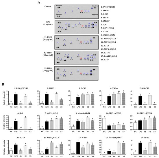 Effects of PLE0s extracted from persimmon leaf at three different maturity stages on the cytokine secretion profiles of RAW264.7 macrophages. (A) The levels of cytokines and chemokines in the culture media were determined with cytokine arrays after the cells were treated with vehicle control, 1 µg/mL LPS, or 50 μg/mL of S1-PLE0, S2-PLE0, or S3-PLE0. Blue numbers indicate increased cytokine and chemokine levels compared with the NC, whereas red numbers indicate decreased chemokine levels. (B) The relative level of each cytokine or chemokine was calculated using Image J software, version 1.8.0_66 (National Institutes of Health, Bethesda, MD, USA). The data shown are presented as the mean ± standard deviation (SD), and lowercases letters (a–e) indicate significant differences (p < 0.05) among five independent groups.