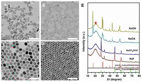 TEM images of NaYF4:Yb3+/Er3+ nanocrystals synthesized with NaOH (A), NaOA (B), CF3COONa (C), and NaF (D) as well as the corresponding XRD patterns (E). The red pentagram represents the peak of silica from the slide. The standard diffraction patterns of the α-NaYF4 (JCPDS 06-0342) and the β-NaYF4 (JCPDS 16-0334) are displayed at the bottom for reference. Scale bars, 100 nm.