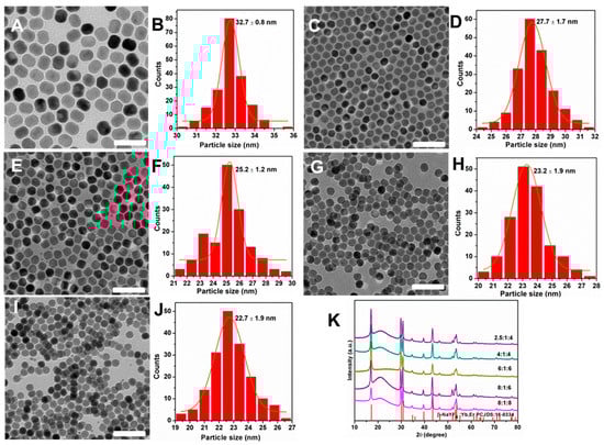 Based on the above results, we firstly used NaOH as sodium sources to explore the effect of Na+/Ln3+/F− on the size and morphology of nanocrystals. A series of NaYF4:Yb3+/Er3+ nanocrystals were synthesized with different ratios of Na+/Ln3+/F− when the volume ratio of OA/ODE was fixed. Figure 2 presents the TEM images and size distributions of the NaYF4:Yb3+/Er3+ nanocrystals. It can be clearly seen that when the molar ratio Na+/Ln3+/F− increased, the particle size of the products decreased accompanied by the shape evolution from rod to sphere. When the molar ratio of Na+/Ln3+/F− was 2.5:1:4, the nanoparticles are regular rods with good monodispersity. Their lengths and widths are 32 nm and 27 nm (Figure 2A,B and Figure S1, Supporting Information), which are obtained by randomly measuring more than 150 particles. When the ratio of Na+/Ln3+/F− was increased from 2.5:1:4 to 4:1:4, the size of the nanocrystals was reduced from 32.7 to 27.7 nm. It has been reported that the simultaneous addition of Na+ and F− in the solution can produce small β-phase seeds, thereby the final growth of small-sized nanocrystals can be controlled easily [28]. Moreover, the size of the nanocrystals was decreased from 25 to 23 nm when the molar ratio of Na+/Ln3+/F− was increased to be 6:1:6 (Figure 2G,H). When the molar ratio was further increased to 8:1:8 (Figure 2I,J), the size of the nanocrystals was reduced to 22 nm.