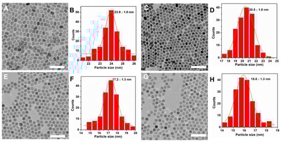 To clarify the role of NaOA, we further studied the effect of its amount on the synthesis of NaYF4:Yb3+/Er3+ nanocrystals. Herein, we used NaOA substitute for NaOH to synthesize diverse nanoparticles with different molar ratios of Na+/Ln3+/F−. Figure 3 shows the TEM images of as-synthesized NaYF4:Yb3+/Er3+ nanocrystals, which exhibited the morphology and size evolution. As expected, the morphology of the nanocrystals changed from rods to spheres. Meanwhile, the size was reduced from about 24 to 16 nm. As the amount of NaOA increased from 1.5 to 2.5 mmol, the size of the nanocrystals decreased to 20 nm (Figure 3A–D). Then the size of NaYF4:Yb3+/Er3+ nanocrystals was further decreased to about 17 nm when the amount of NaOA increased to 6 mmol (Figure 3E,F) and 8 mmol (Figure 3G,H), respectively. It was possible that oxygen moiety in the OA–ligands had a much stronger binding affinity to Y3+ ions when there were adequate OA–ligands with the increased of NaOA.