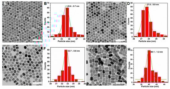 TEM images and size histograms of NaYF4:Yb3+/Er3+ nanocrystals synthesized with NaOA by using Na+/Ln3+/F− withmolar ratios of 1.5:1:4 (A,B), 2.5:1:4 (C,D), 6:1:4 (E,F), and 8:1:4 (G,H), respectively. Scale bars, 100 nm.