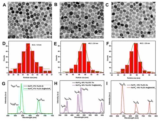 TEM images, size histograms, and the corresponding upconversion spectra of core–shell structured NaYF4:Yb3+/Er3+@NaGdF4 (A,D,G), NaYF4: Yb3+/Tm3+@NaGdF4 (B,E,H), and NaYF4:Yb3+/Ho3+@NaGdF4 (C,F,I), respectively. Scale bars, 100 nm.