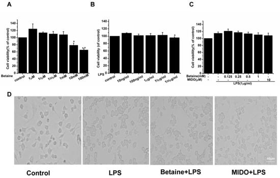 Effects of betaine on the viability and morphological changes of N9 microglial cells with or without LPS stimulation. (A) Effects of betaine alone on cell viability. (B) Effects of lipopolysaccharide (LPS) alone on cell viability. (C) Effects of betaine with or without LPS stimulation on cell viability. Cells were treated with betaine or MIDO (10 μM) for 1 h and then stimulated with LPS (1 μg/mL) for 24 h. (D) Effects of betaine with or without LPS stimulation on morphological changes. MIDO was used as a positive control. Data are presented as the means ± SEM of three independent experiments. Untreated cells served as a control group. * p < 0.05 and ** p < 0.01, compared to the control group.