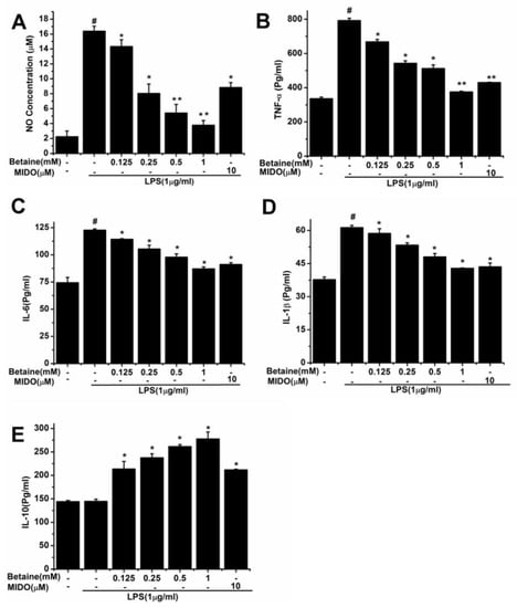 Effects of betaine on LPS-induced inflammatory cytokine and NO release in N9 microglial cells. Cells were treated with betaine or MIDO (10 μM) for 1 h and then incubated with or without LPS (1 μg/mL) for 24 h. (A) NO concentration in the supernatants was measured by NO one-step detection kit. (B–E) Levels of TNF-α, IL-6, IL-1β, and IL-10 in the supernatants were determined by ELISA. MIDO was used as a positive control. Data are presented as the means ± SEM of three independent experiments. The control group included untreated cells. Untreated cells served as a control group. # p < 0.05, compared to the control group; * p < 0.05 and ** p < 0.01, compared to the LPS-treated group.