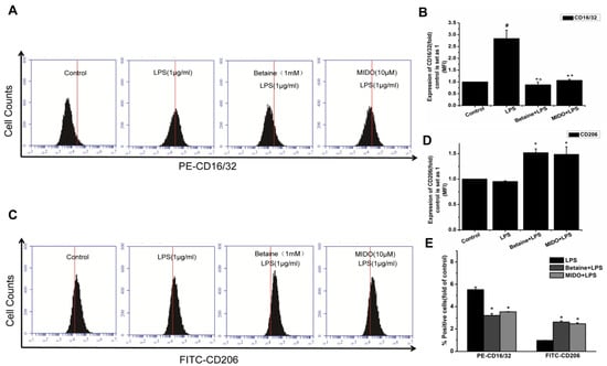 Effects of betaine on LPS-induced protein expression of CD16/32 and CD206 in N9 microglial cells. N9 microglial cells was treated with betaine (1 mM) or MIDO (10 μM) for 1 h and then incubated with or without LPS (1 μg/mL) for 24 h. (A,C) CD16/32 (M1) and CD206 (M2) protein expression levels were determined by flow cytometry. (B,D) The expression levels of CD16/32 and CD206 with or without LPS treatment were compared. Control is set as 1. (E) Quantitative positive cells of an overlay of “control” with each of the treatments. MIDO was used as a positive control. Data are presented as the means ± SEM of three independent experiments. The control group included untreated cells. Untreated cells served as a control group. # p < 0.05, compared to the control group; * p < 0.05 and ** p < 0.01, compared to the LPS-treated group.