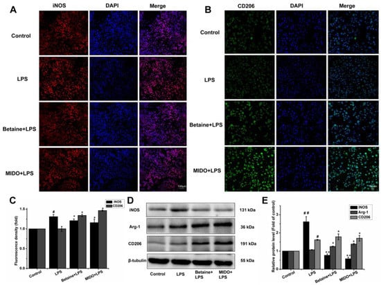 To further determine whether betaine switches the polarisation of N9 microglial cells to the anti-inflammatory M2 phenotype under LPS stimulation, nitric oxide synthase (iNOS), arginase-1 (Arg-1), and CD206 expression was measured. iNOS represents M1 microglial polarisation, whereas Arg-1 and CD206 represent M2 microglial polarisation. Immunofluorescence staining (Figure 4A,B) and western blot analysis (Figure 4D,E) showed that LPS-stimulated N9 microglial cells exhibited higher expression of iNOS than that in the control (Figure 4A); however, the expression of CD206 in N9 cells was not markedly changed by LPS (Figure 4B). Furthermore, the expression of Arg-1 slightly increased (Figure 4D). Interestingly, betaine significantly decreased the expression of iNOS and increased that of CD206 and Arg-1 in LPS-stimulated N9 cells. MIDO was used as a positive control. In summary, these results indicated that betaine shifted LPS-induced inflammatory M1 microglia toward anti-inflammatory M2 microglia.