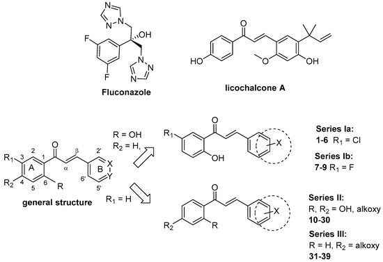 In an effort to uncover new starting points for antifungal drug discovery, an in-house small library of chalcone-based analogues (Table 1) was screened against C. albicans, as a continuation of our exploration of this privileged scaffold as suitable template for developing anti-infective agents. Indeed, some members of the library have been previously tested versus Leishmania donovani [17], and a number of compounds endowed with encouraging in vitro activity were identified. To gain insight into the key features for eliciting the antifungal effect, the chemical variability of the chalcones regarded the substitution patterns of the A- and B-rings, as depicted in Figure 1, resulting in Series I, II, and III. Concerning the A-ring: a) Series I was characterized by a 2,5-substutution pattern; in particular, a hydroxyl group was introduced into the 2-position, while a halogen atom such as chlorine or fluorine occupies the 5-position to give Series Ia and Ib, respectively. b) Series II was characterized by a 2,4-disubstitution pattern; in details, position-2 was decorated with hydroxy, methoxy, or propargyloxy functions, while various alkoxy functions were appended into the 4-position. c) Series III contained an alkoxy function into the 4-position. Regarding the B-ring, the following substituents were frequently introduced: 2,4-diCl, 4-dimethylamino, 4-nitro, 4-fluorine, 3- and 4-pyridyl. A number of tested compounds were characterized by a pyridine heterocyclic nucleus (12, 13, 16, 20, 21, 24, 25, 32, 33, 36, 37) as a privileged moiety present in several anti-infective agents [18], and by a F-phenyl ring (2–5, 7, 8, 10, 18, 22, 28‒31). This small and highly electronegative atom confers special chemical reactivity to the molecule by imparting several favorable properties including improved metabolic stability, selectivity, and efficacy in binding [19]. Taking advantage of these important issues, we successfully exploited this substituent for drug discovery purposes [20,21].