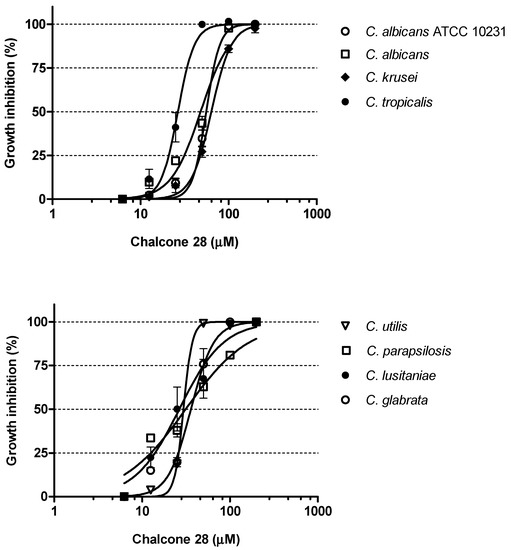 Dose–response curves of chalcone 28 obtained with C. albicans ATCC 10231 and all Candida spp. clinical isolates.