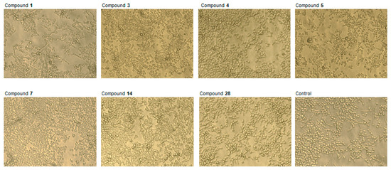 In particular, compounds 4, 5, 14, and 28 did not display any toxicity, as they did not interfere at all with Vero metabolism, even at the highest concentration of 200 μM. In addition, compounds 1, 3, and 7, showing triple-digit micromolar CC50 values (174.1 µM, 151.8 µM, and 181.7 µM, respectively), only slightly affected eukaryotic cell growth, and could therefore be considered non-toxic.