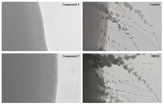 The ability of the seven chalcones to weaken microbial virulence was further investigated in C. albicans ATCC 10231. A key virulence factor expressed by C. albicans that significantly contributes to its pathogenicity is the transition of yeast cells to filamentous cells. The formation of germ tube and mycelium is an essential process for host tissue invasion, damage to mucosal epithelia, escape from host immune cells, and blood dissemination. Additionally, the conversion of C. albicans from yeast to hyphae is related to the expression of specific adhesins that are involved in the formation of biofilms [4]. For this purpose, C. albicans was cultured for 2 h in an RPMI-1640 medium supplemented with serum at 10% and containing the chalcones 1, 3–5, 7, 14, and 28 at IC50 values, and then evaluated for their effect on hyphae formation.