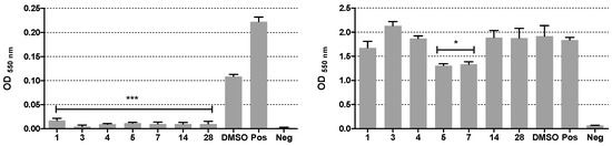 Antibiofilm activity of the selected chalcones on biofilm formation (left panel) and disruption (right panel). Values are reported as mean ± SD. Biofilm formation: *** p < 0.0005 for chalcones 1, 3–5, 7, 14, and 28 vs. DMSO/positive control. Biofilm disruption: * p < 0.05 for chalcones 5 and 7 vs. DMSO/positive control. The negative control consists of the medium only.