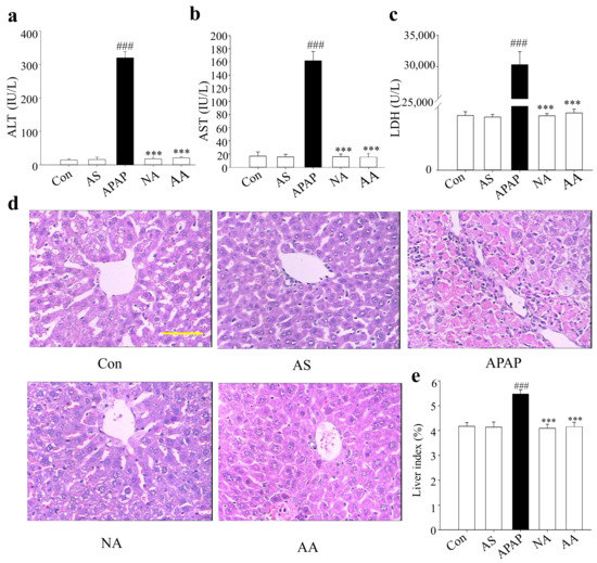 2.1. Protection of the Liver by AS against the APAP-Induced Injury in Mice