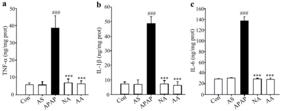 2.4. Effects of AS on TNF-α, IL-1β, and IL-6 Levels in the Liver