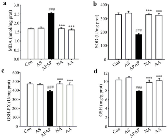 2.5. Effects of AS on MDA, SOD, GSH and GSH-PX Levels of Liver Tissues