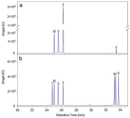 Gas chromatographic conditions: Hue chromatography column, DB-5MS capillary column (30 m × 0.5 cm × 0.25 μm); carrier gas, high purity helium (99.99%); injection volume 2 μL; carrier gas flow rate 1.0 mL/min; split ratio 10:1; inlet temperature 220 °C; temperature programming conditions, the starting temperature is 100 °C; rise to 180 °C at 5 °C /min for 1 min; 1 °C/min to 190 °C for 2 min; to 30 °C/min rises to 220 °C for 2 min; rises to 230 °C at 1 °C/min for 2 min; rises to 280 °C at 20 °C/min for 10 min.