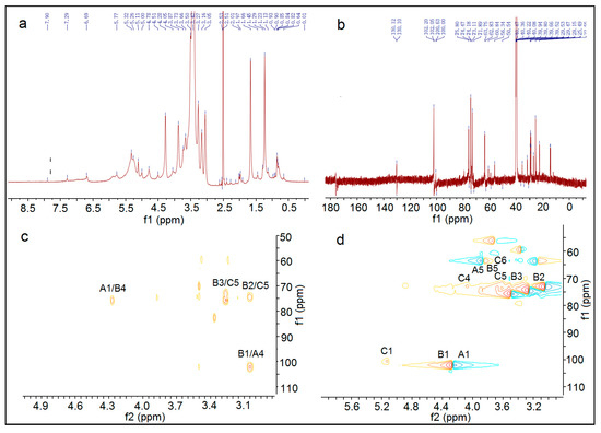 According to the literature [51], 30 mg dry polysaccharide sample AX-I-3b was dissolved in 0.5 mL DMSO-d6. 1H-NMR, 13C-NMR, and 2D-NMR (HMBC and HSQC) spectra were obtained at 30 °C.