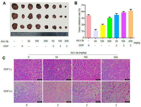 As shown in Figure 7A,B, compared with the model group, the tumors of the transplanted tumor mice in AX-I-3b group at the middle and high doses, as well as in the combined drug group, were significantly smaller (p < 0.05). Compared with the DDP alone group, the tumor inhibition rate of DDP combined with medium and high dose AX-I-3b administration group was significantly increased with 58% and 61%, respectively, and the differences were statistically significant.