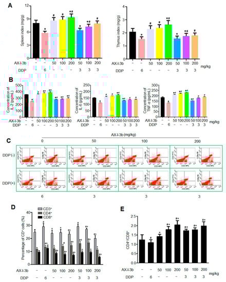 Polysaccharides from A. radix are generally used as an immunomodulatory treatment in the clinic [14], suggesting that AX-I-3b probably regulates immunity. To confirm this, the effect of AX-I-3b on immunity was investigated. As shown in Figure 8A, compared with the model group, the organ index of the spleen and thymus of the DDP alone group was significantly decreased, indicating that the immune organs were damaged after DDP administration, and the immune function was inhibited [15], while the organ index of spleen and thymus of AX-I-3b alone group increased, showing a certain protective effect of polysaccharide on immune organs. Compared with the DDP group, the immune organ indices of the thymus and spleen of the AX-I-3b alone group and the combined group significantly increased. The immune organ index of the combined drug group was higher than that of the DDP group while lower than that of the AX-I-3b group, which may relate to the immune organ damage caused by DDP.