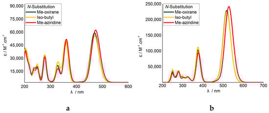We report here the continued exploration of the N-alkylation of isoindigo, with a focus on the incorporation of aziridines and epoxides, which are valuable synthetic building blocks for subsequent synthetic manipulation [32,33,34]. The N-alkylation of the related (3Z,3’Z)-3,3’-(ethane-1,2-diylidene)bis(indolin-2-one) as an extended π-conjugated dimeric heterocycle was also investigated. Selected isoindigo-aziridine and -oxirane derivatives were then studied using DFT and TD DFT for isoindigo-thiophene DA monomers and dimers and compared with the previously characterized PTI1 [25], alkylated analogue in order to establish the effect of functional groups on photophysical properties. Results were further probed by investigating other proposed N-alkylations with electron-withdrawing functional groups, which focused on changes to the calculated vertical excitations.