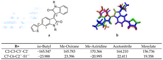 (a) Thiophene-isoindigo with atom numbers included. (b) Overlay of thiophene-isoindigo monomers with iso-butyl (blue), acetonitrile (green) and mesylate (red) N,N′-disubstitutions. Table shows torsion angles in the thiophene-isoindigo system for selected substitutions.