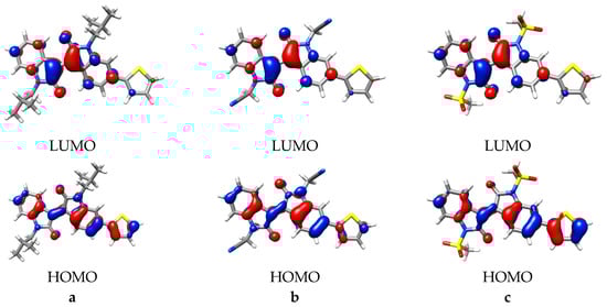 The highest occupied molecular orbital (HOMO)/lowest unoccupied molecular orbital (LUMO) pairs for (a) iso-butyl, (b) acetonitrile, and (c) mesylate substitutions (monomers). Isovalue = 0.04.