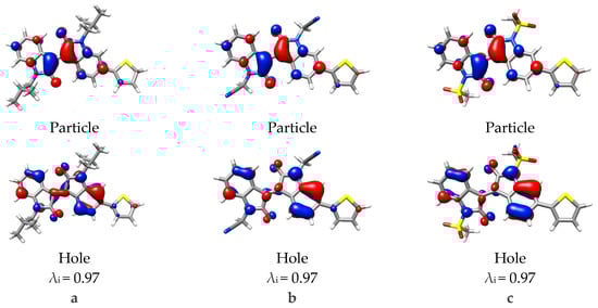 Natural transition orbitals for the 3rd vertical excitation calculated with TD-DFT for monomers (a) iso-butyl, (b) acetonitrile, and (c) mesylate substitutions. Eigenvalue (λi) for the transition also provided, isovalue = 0.04.
