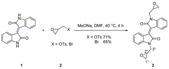 The N-substituted reactions of isoindigo (Scheme 1) and (3Z,3’Z)-3,3’-(ethane-1,2-diylidene)bis(indolin-2-one) (Scheme 2) with epoxides of (S)-glycidyl tosylate, epibromohydrin and aziridine heterocycles such as 2-(bromomethyl)-1-(arylsulfonyl)aziridine, and 2-(bromomethyl)-1-(alkylsulfonyl)aziridine were investigated, using sodium methoxide as a base. Therefore, reaction of isoindigo 1 with (S)-glycidyl tosylate or epibromohydrin 2 gave the (E)-1,1’-bis(oxiran-2-ylmethyl)-[3,3’-biindolinylidene]-2,2’-diones 3 in 71% and 65% yield respectively.