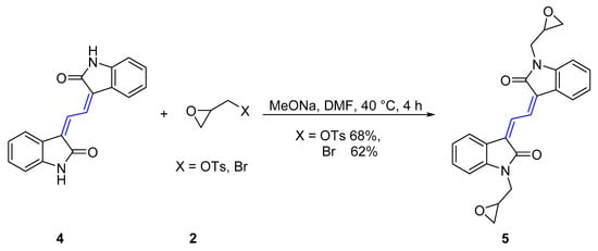 The isoindigo analogue (3Z,3’Z)-3,3’-(ethane-1,2-diylidene)bis(indolin-2-one) 4 is an extended π-conjugated dimeric heterocycle that has recently been investigated for applications in performance organic semiconductors [35]. Derivatives of this molecule were synthesized by reaction of 4 with (S)-glycidyl tosylate or epibromohydrin 2 in the presence of MeONa in DMF at 40 °C for 4 h, which gave (3Z,3’Z)-3,3’-(ethane-1,2-diylidene)bis(1-(oxiran-2-ylmethyl)indolin-2-one)s 5 in 68% and 62% yield respectively (Table 1). Analysis of the FTIR spectrum of 5 showed an absorption at 1689 cm−1 assigned to the two identical carbonyl moieties and the UV-vis spectrum showed two absorption maxima at 201 and 302 nm for this red compound. The HRESI mass spectrum showed a peak at m/z 423.1313, assigned to the molecular formula C24H20N2O4Na and was indicative of the addition of two 2-methyloxirane units.