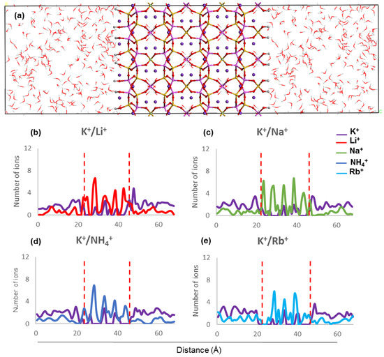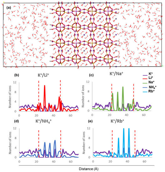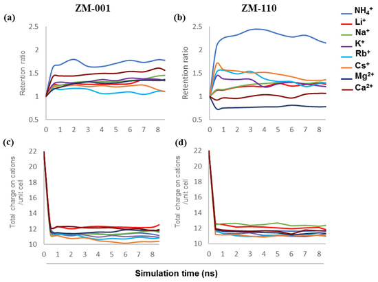 Both ZM-001 and ZM-110 membranes contain 80 Si and Al atoms, 96 K+ and 12 Cl− ions and 128 water molecules. The charge of the framework in each membrane is −80e. In order to investigate the retention of ions inside membranes, a chemical potential is created between the inside and outside of the membranes. The guest Mn+ (n = 1 or 2) cations are placed randomly inside the membranes and 40 chloride ions are distributed in the solvent on either side of the membranes. The number of guest cations depends on their total charge compensating the −80e of frameworks. Therefore, the number of added guest mono-and divalent cations are 80 and 40, respectively. The guest ions include NH4+, Li+, Na+, K+, Rb+, Cs+, Mg2+ and Ca2+ cations. The models created containing guest cations and extra chlorides, are designated as K+/Mn+ systems in the results and discussion sections (represented in Figure 2a and Figure 3a).