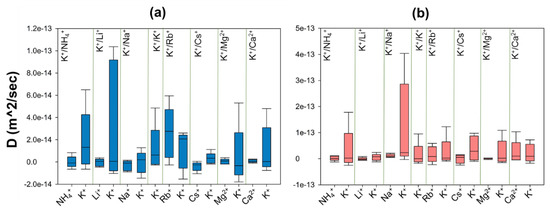 The diversity of self-diffusion coefficients for K+ and Mn+ guest cations of each exchanging system inside (a) ZM-001 and (b) ZM-110 membranes.