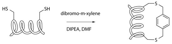 - Wang, Y.; Bruno, B.J.; Cornillie, S.; Nogieira, J.M.; Chen, D.; Cheatham, T.E.; Lim, C.S.; Chou, D.H. Application of Thiol-yne/Thiol–ene Reactions for Peptide and Protein Macrocyclizations. Chem. A Eur. J. 2017, 23, 7087–7092. [Google Scholar] [CrossRef] [PubMed]