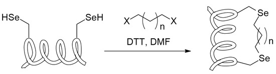 - de Araujo, A.D.; Perry, S.R.; Fairlie, D.P. Chemically Diverse Helix-Constrained Peptides Using Selenocysteine Crosslinking. Org. Lett. 2018, 20, 1453–1456. [Google Scholar] [CrossRef] [PubMed]