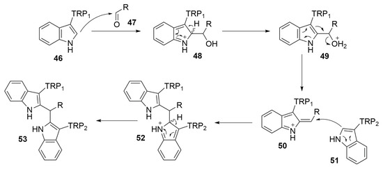 - Akgun, E.; Tunali, M. Acid catalyzed aldehyde-indole reaction, synthesis of diindolylantipyrylmethane dyes. Archiv Pharm. 1988, 321, 921–924. [Google Scholar] [CrossRef]
