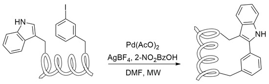 - Mendive-Tapia, L.; Preciado, S.; Garcia, J.; Ramon, R.; Kielland, N.; Albericio, F.; Lavilla, R. New Peptide Architectures Through C–H Activation Stapling Between Tryptophan–phenylalanine/tyrosine Residues. Nat. Commun. 2015, 6, 7160–7168. [Google Scholar] [CrossRef]