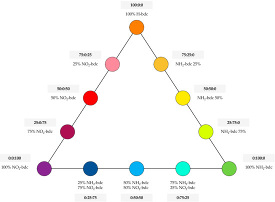 UiO-66-functionalized variants were prepared analogously, replacing H-bdc with the equivalent molar amounts of NH2-bdc or NO2-bdc, depending on the specific MOF under preparation. In this sense, different ratios of NH2-bdc, NO2-bdc, and H-bdc were included in the synthetic approach, with the purpose of obtaining MOFs with different amounts of functionalities. The final set includes the preparation of up to 12 derivatives of the UiO-66 MOF, with the specific contents included in Figure 1.