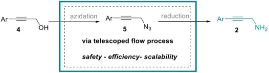 To support an ongoing synthesis program, we required a robust and scalable route towards a variety of different propargylic amines 2 bearing different aryl-substituents. In view of potential safety concerns that might manifest during reaction scale-up, we opted to develop a continuous flow protocol that would not only enable and streamline the assembly and delivery of these entities, but also mitigate any safety concerns associated with the introduction and subsequent reduction of the azide functionality. The latter is commonly accomplished under Staudinger reduction conditions releasing stoichiometric amounts of nitrogen gas in the process. Thus, we aimed at developing a telescoped process that would allow performing these two steps in a continuous flow reactor [15,16,17,18,19,20,21,22] to conveniently and safely [23] deliver a small selection of these propargylic amines on multi-gram scale.