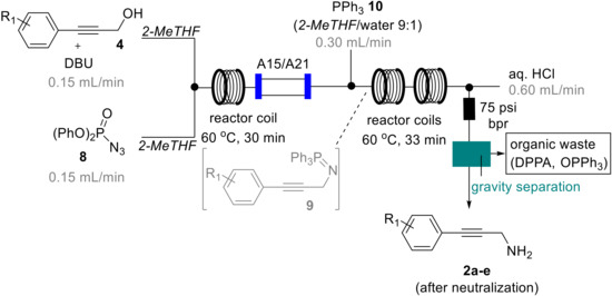 Subsequent batch test reactions for the desired Staudinger reduction of intermediates 5 had indicated that the transient iminophosphorane species 9 along with nitrogen gas is readily formed upon treatment of the azide intermediate with triphenylphosphine (10, 1.3 equiv. in THF). Furthermore, the hydrolysis of the iminophosphorane turned out to be a facile process yielding the desired propargylic amines upon addition of water (10% by volume) to this reaction mixture.